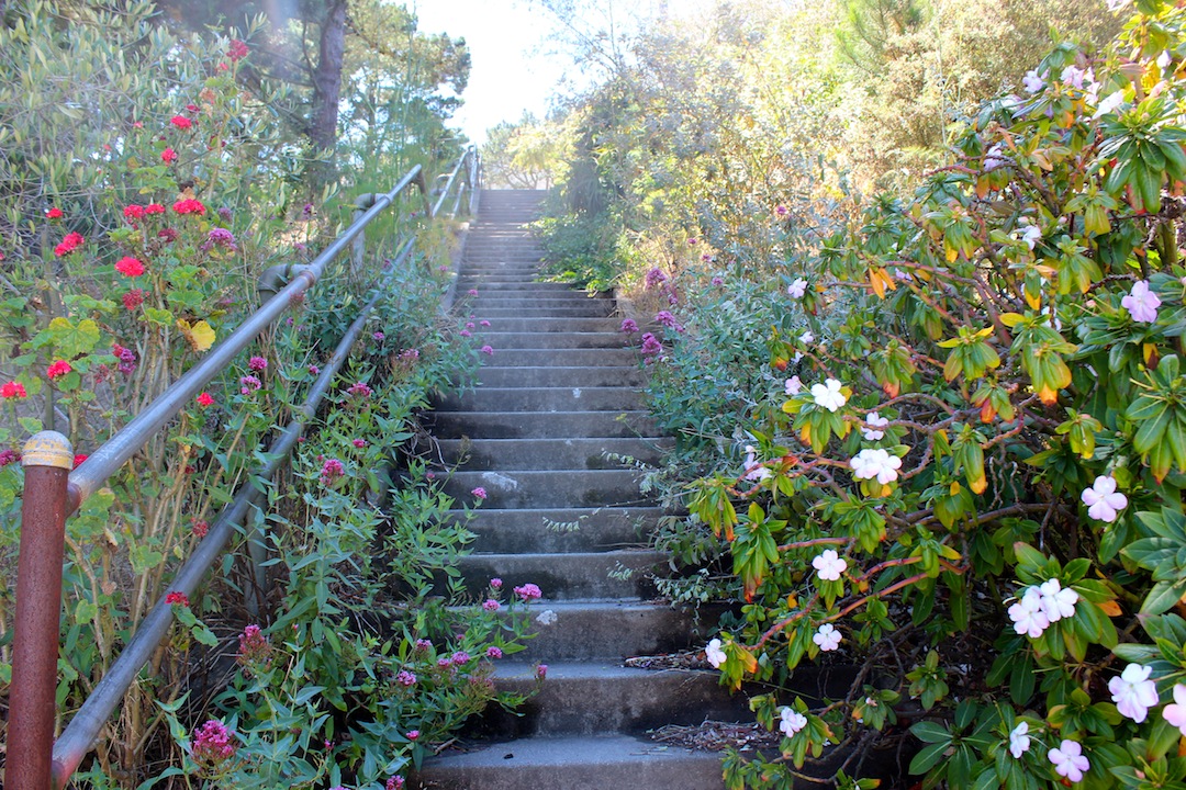 “You’ll see,” said Rosie’s mother. When they reached the narrow street sidewalk, they turned left and walked north where another set of stairs on the street rose up to Scenic Avenue. This staircase was made out of thick eight-foot wide old railroad tie planks, each dark step set into the hill and secured with large, iron bolts. The bannister was built out of redwood posts with a diagonal lattice in-between.