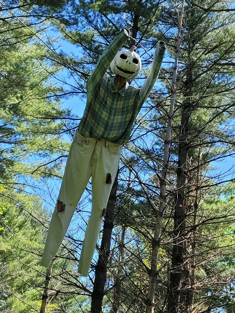 While we walked around the top of the ridge on Great-Grandpa’s property, we found wild carrots and asparagus—souvenirs from the gardens that once fed the Bronk families.  Hanging high above a hiking trail, we found a scarecrow with a Jack-o-lantern head, plaid shirt, and farmer pants.  Mark told us that a solar light made the head light up at night, creating an unexpected scary encounter.  We watched big, Eastern Tiger Swallowtail butterflies settle on wild flowers and examined tiny pine cones that fell from the white pine trees.  The floor of the forest was covered in a thick matting of dead pine needles, hiding the remnants of our relatives’ lives.