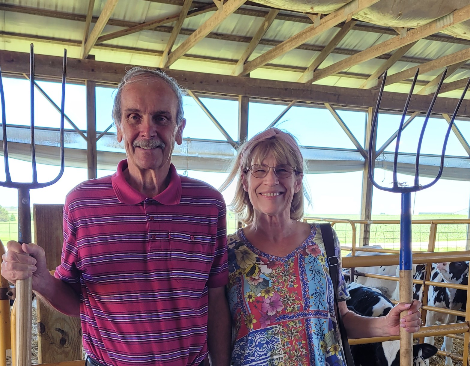 We got to the farm before Scott did, and his workers told us to wait outside.  As we walked through a barn full of teenage cows—some with the cutest faces, we found some pitchforks and posed for a picture like Grant Wood’s 1930 American Gothic painting, except both my husband Bob and I held a pitchfork since we believe in equality.  In Grant’s painting, the farmer’s daughter didn’t have a pitchfork in her hand.  I hate to think what Scott’s pitchforks were actually used for and what debris was on the handles that I touched, but I wasn’t going to pass up a great opportunity for a memorable photograph.