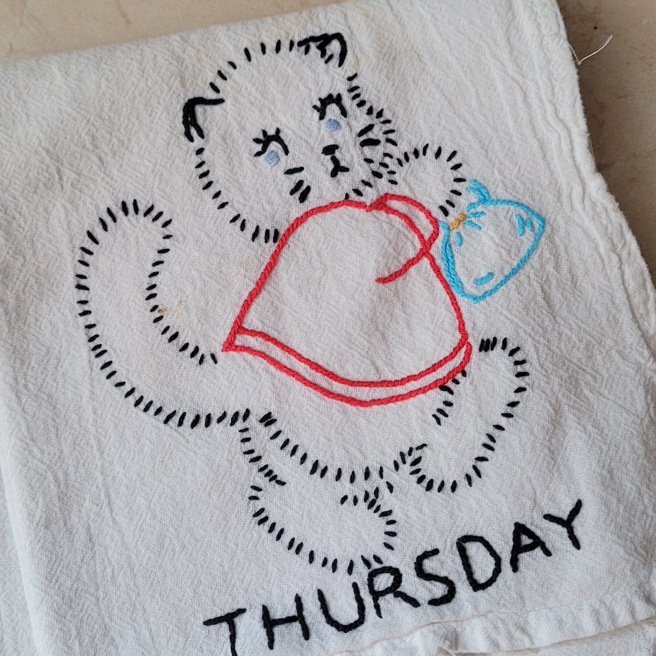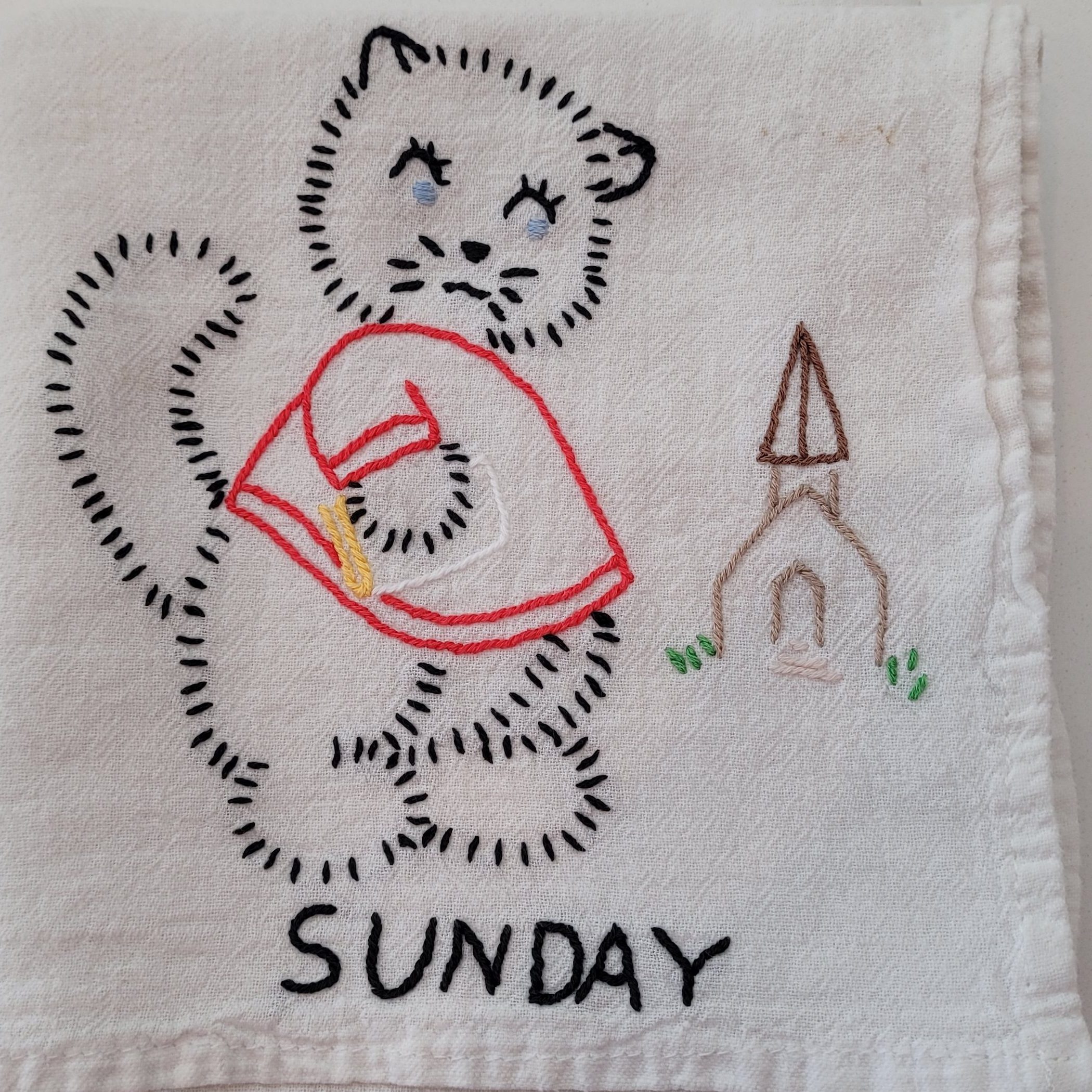 Grandma Lillian took the train to California several times to help my parents when my mother was in the hospital having another child. During these times, I learned about who she was as a person. I watched her embroider cotton tea towels, one for every day of the week. For each day, she embroidered a kitten performing a different kitchen task with one exception. For example, on Thursday’s towel, the kitten was carrying a tea kettle to the stove. On Sunday, the kitten was not doing kitchen work since she was going to church. She taught me how to embroider, but I was too impatient to make the stitches neat.