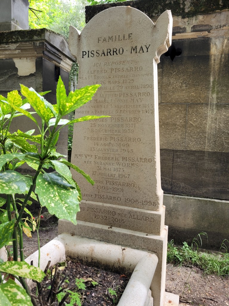 The cemetery has a few paved paths and dozens of tiny dirt paths that take visitors past the graves. To find Pissarro, we took a right just inside the gate to walk along the west perimeter of the cemetery’s wall. After several steps, sure enough, we found Pissarro’s crypt where at least eight family members were buried. The names were listed on a grand rounded slab of white marble with two angel wings sticking out at the top.
