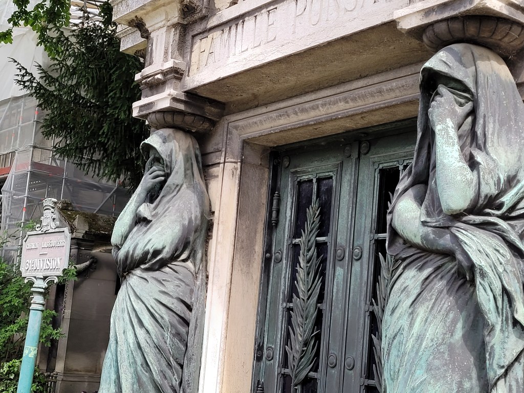 The last person I wanted to find was Frédéric Chopin, the Polish composer that I mentioned earlier. According to my almost useless map, he was buried at the juncture of three dirt paths a short walk away from the Monument aux Morts, a grandiose marble monument to the dead with several grieving statues. I left my husband again, sitting on a bench along the circular road that surrounds the monument, and, again, I traipsed uphill to find Chopin. Standing on the path, I searched every name on the tombstones near the juncture. No Chopin. Feeling desperate, I courageously scooted between the tightly packed graves to read the graves behind them. No. I hurriedly got out of there. Chopin didn’t want to be found.