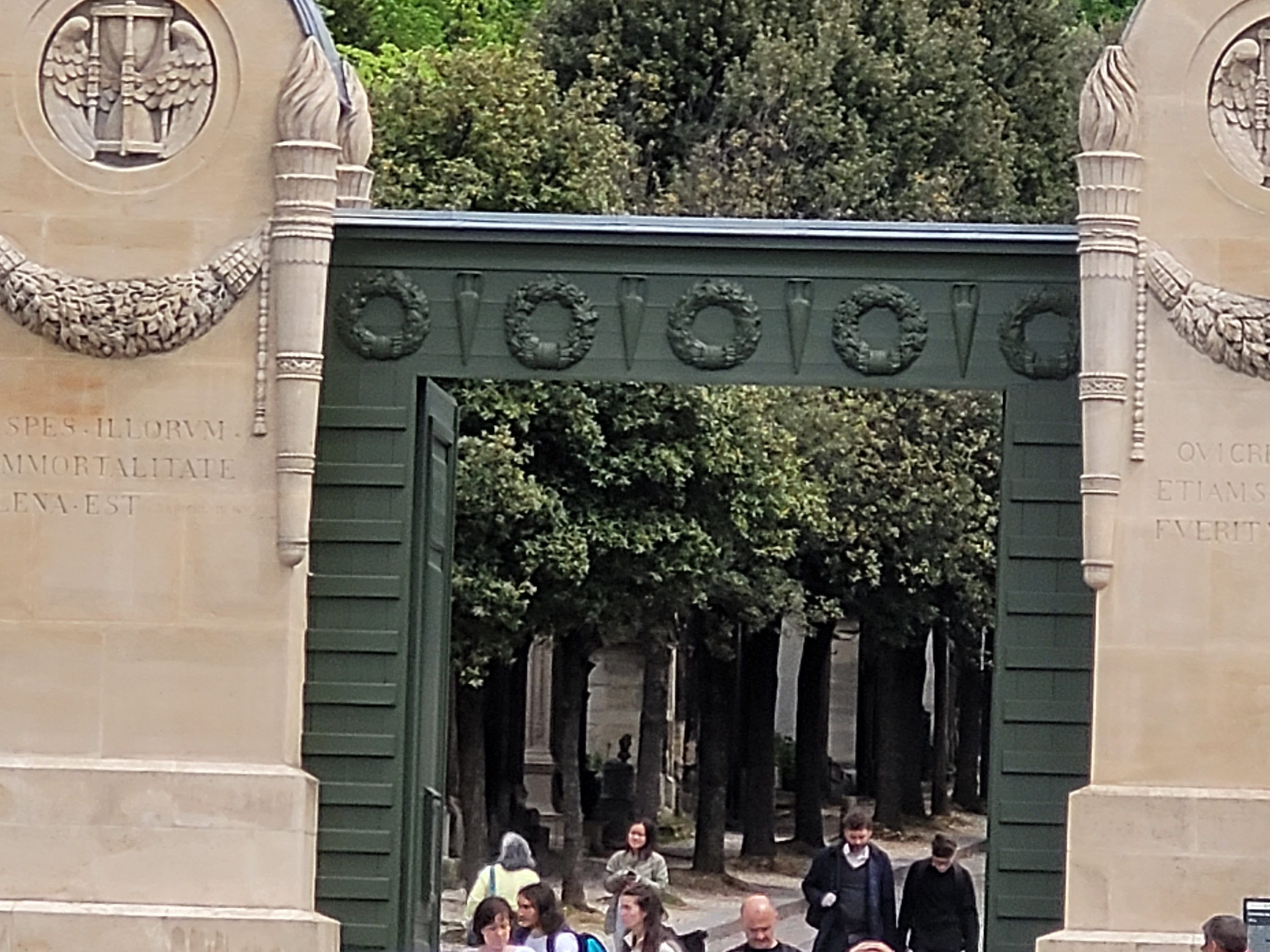 The entrance was a massive olive-green set of doors framed by wreaths. On both sides, the doors were flanked by two white granite columns topped with the carving of an hour glass circled by angel wings. The doors were open and, inside, we could see several erect tall tree trunks with leafy branches. In-between the trees, blackened marble mausoleums and statues beckoned to us.