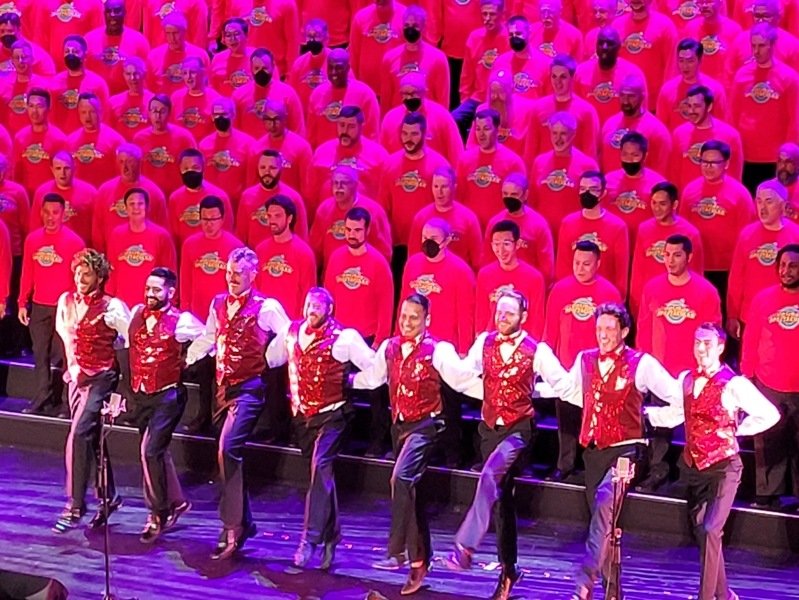 The stage curtain was lit up with the title of the chorus in capitalized red letters, and, a few minutes later, the curtain opened to reveal the silhouette of risers brimming with over 200 singers. The lights came on, and the audience suddenly saw ten rows of men dressed in long-sleeved red T-shirts and black bottoms on a staircase of risers. The orchestra began, the conductor raised his arms, and the men began to sing.